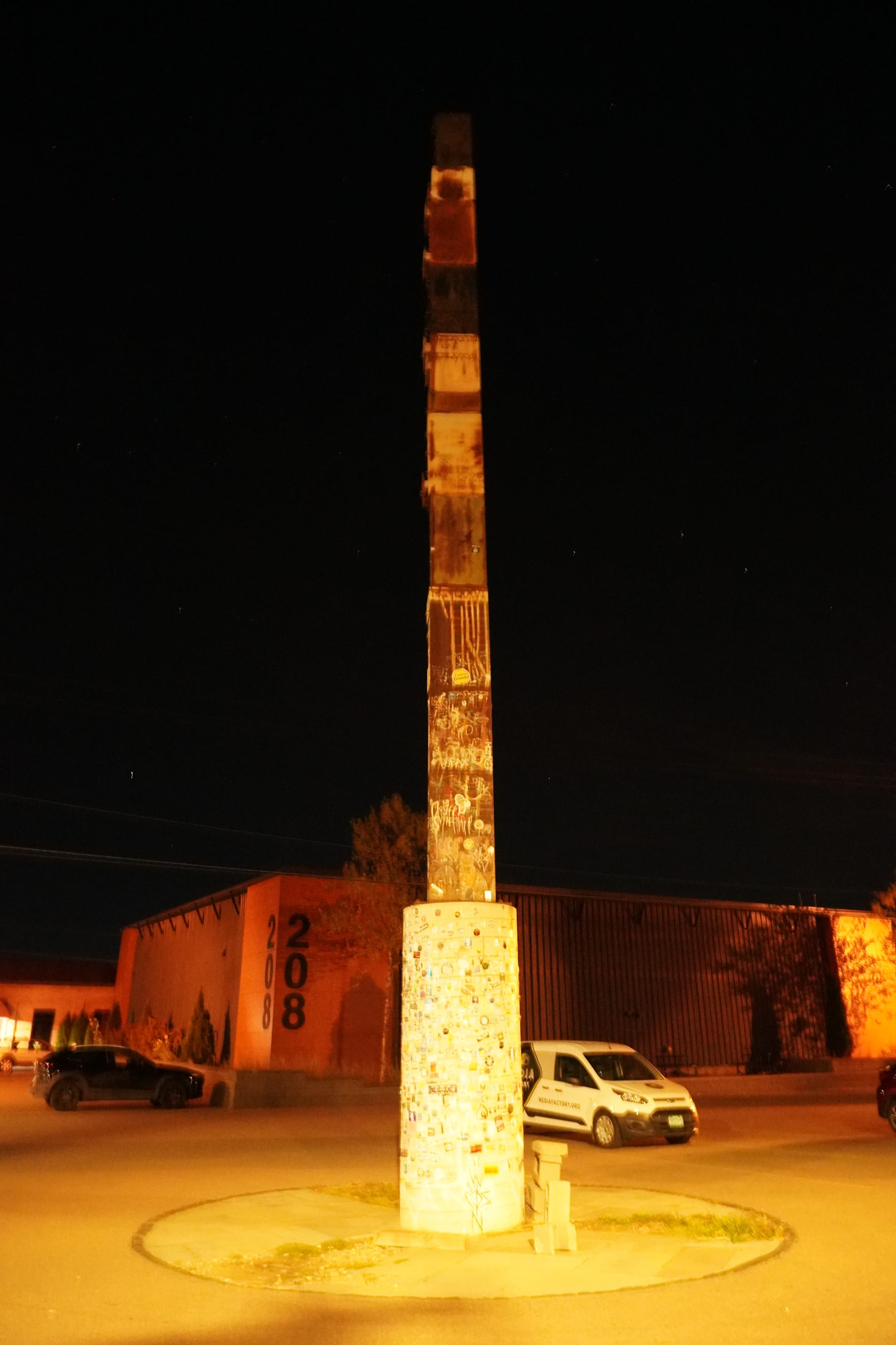 Felt like I was at the center of the universe. I gazed up at the stack, yet since the top cabinets were painted a dark color they seemed to stretch up into the night sky. A purposeful choice on someone's part no doubt. The stickers climbing the stack told a million stories. Starting from it cinder block base and climbing up, feathering out the higher they got. I imagined friends here seeing who can jump and stick a sticker the highest. I see tall people picking up short people to help them get their stickers higher, from friend picking up friend to parent picking up child. I dwell in the moment. For just a second.